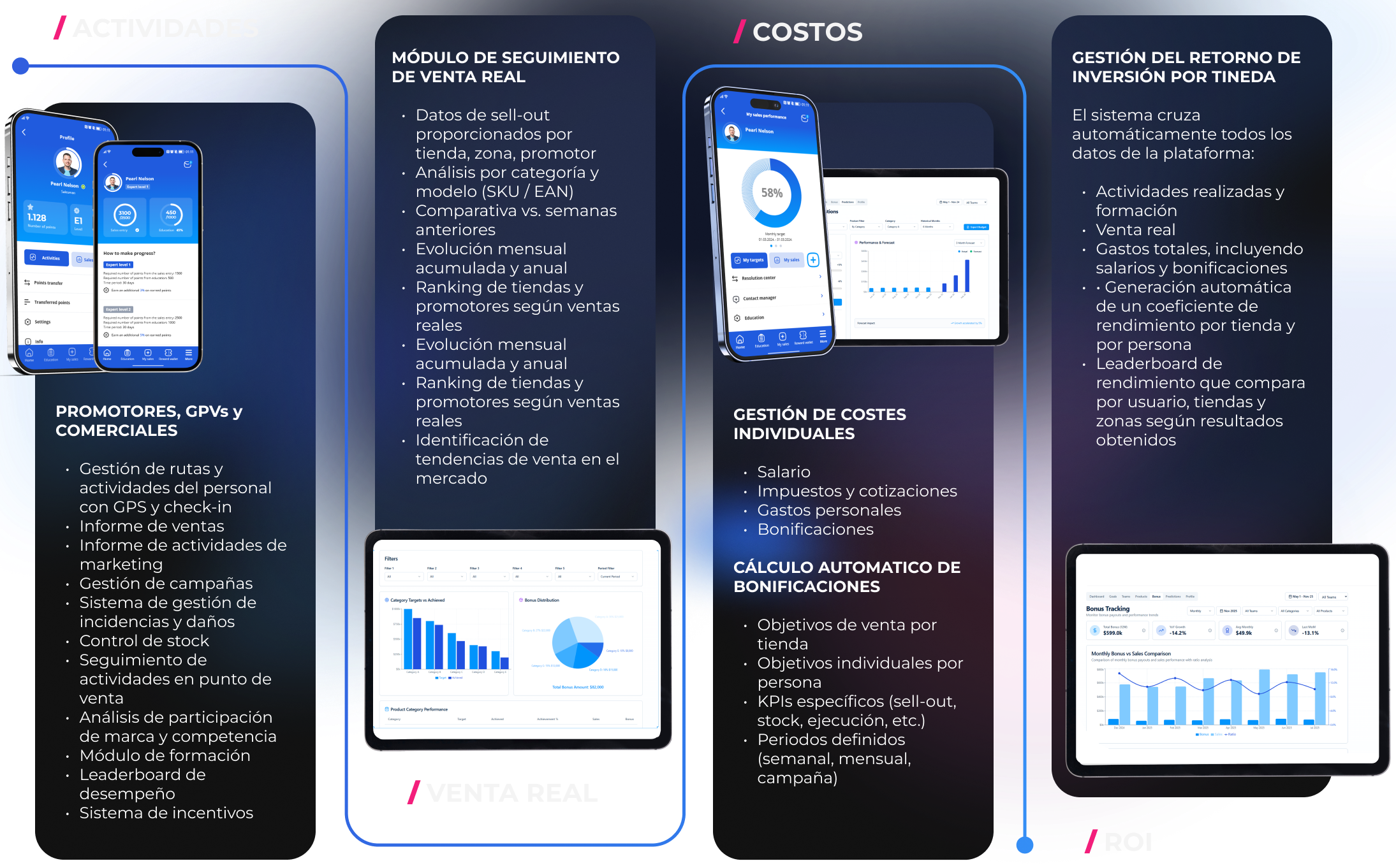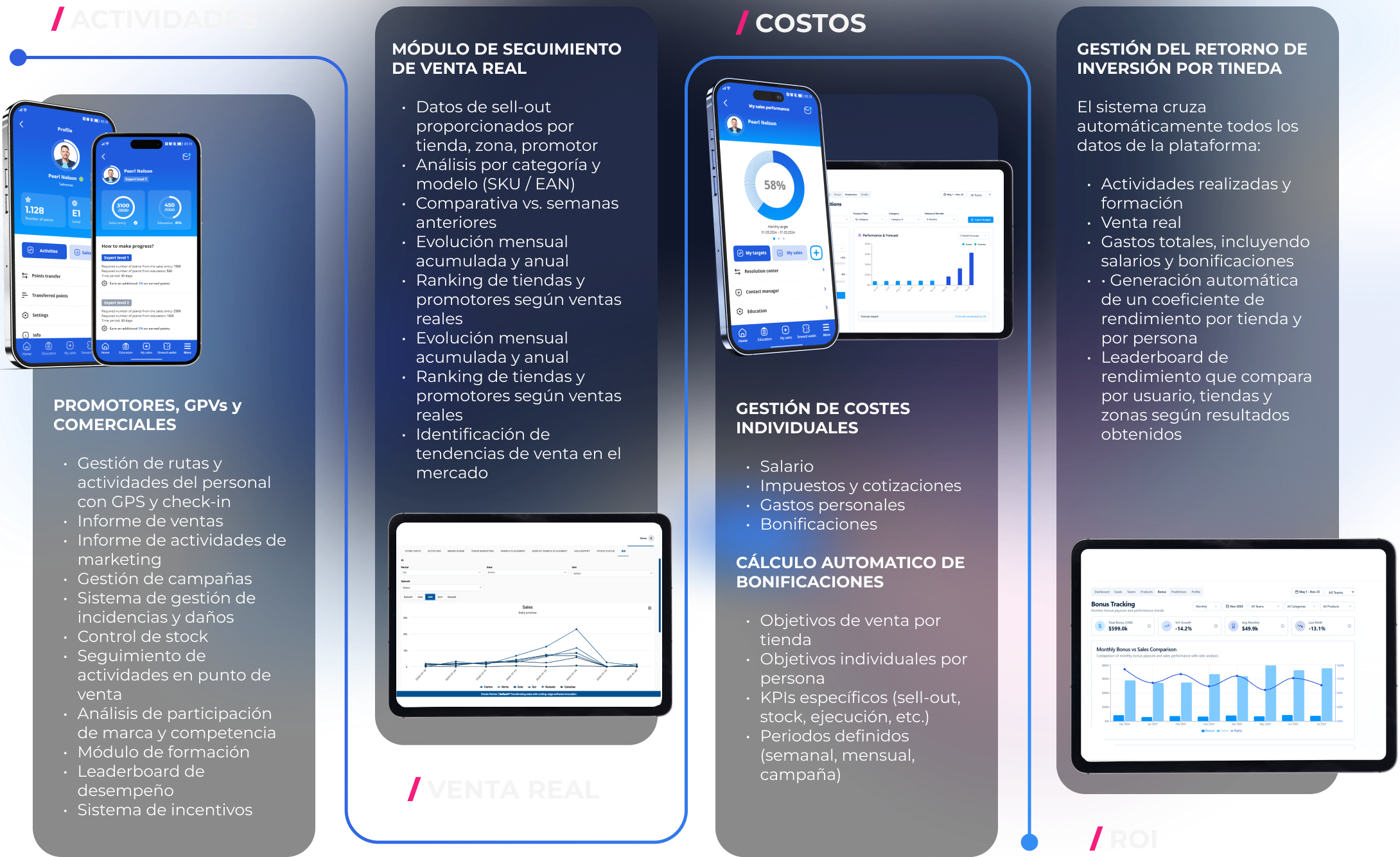 Softech conecta actividades, ventas reales, costes de personal y ROI en una sola plataforma, permitiendo entender cómo cada persona en la red de retail contribuye directamente a los resultados de ventas.